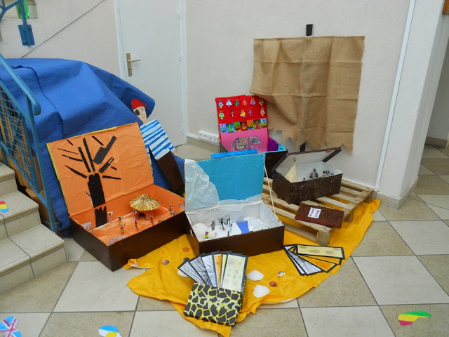 Pour annoncer l'exposition et notre grand jeu, un grand panneau avait été réalisé par les enfants. (Tiens, je l'ai encore celui-là, qui encombre une petite salle... il pourrait peut-être venir compléter mon musée ?)